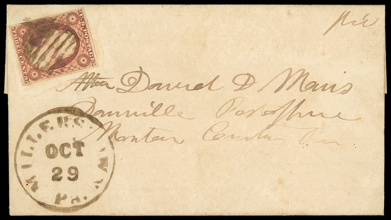 Brown Circular Grid, cancel ties 3¢ dull red (11A) , four large margins, matching brown " Millerstown Pa. Oct 29 " cds on 1856 folded letter to Danville Pa., Extremely Fine and choice true brown cancel use.