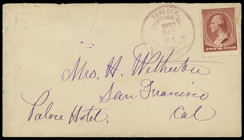Wheel of Fortune (Turlock, Cal.), purple strike duplexed with fancy "Turlock, Stanislaus Co., C.F. Lander, P.M., California, 1883 Dec 23" cogged cds cancels 2¢ red brown (210) on cover to San Francisco Cal., Dec. 23rd arrival backstamp; top edge tear, F.-V.F. and scarce.
