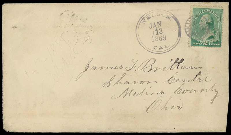 Wheel of Fortune (Turlock, Cal.), clear strike duplexed with "Nelson, Cal. Jan 13, 1889" cds on amber cover to Sharon Centre, Ohio; reduced at right, F.-V.F. and scarce California town.