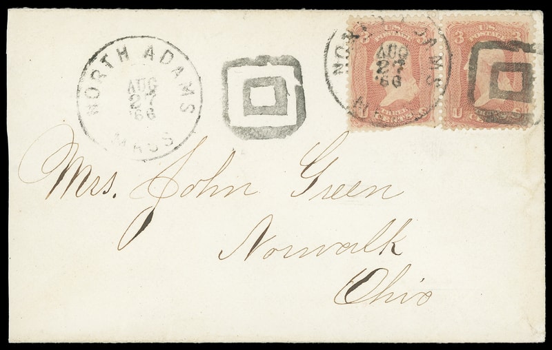 Double Rectangle, sharp strike duplexed with "North Adams Mass. Aug 27 '66" cds ties 3¢ rose (65) pair , complete strike adjacent on cover to Norwalk, Ohio; reduced slightly at left, left 3¢ with some perfs torn away, Very Fine strikes.
