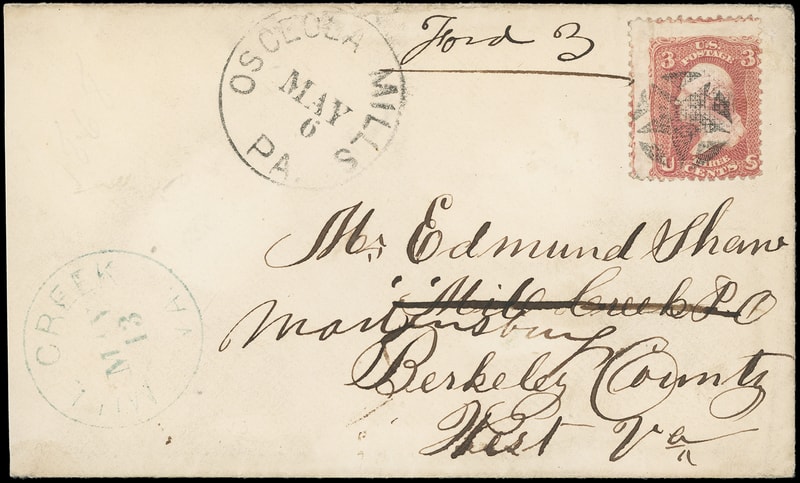 Star, fancy cancel on 3¢ red, F grill (94) , matching "Osceola Mills Pa. May 6" cds on cover to Mills Creek W.V., forwarded with "Mills Creek, Va. May 13" cds and ms. " Ford 3 " rating, F.-V.F. forwarded use.