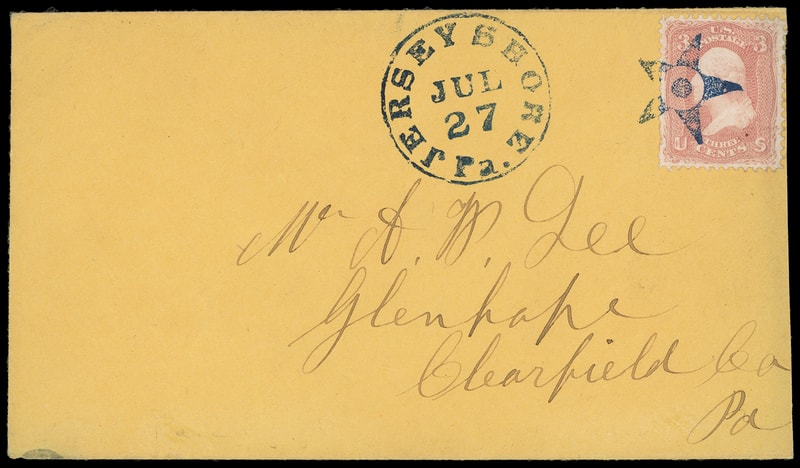 Star with Center Dot, neat blue strike ties 3¢ rose (65) , pulled perf, matching bold "Jersey Shore Pa. Jul 27" cds on orange cover to Glen Hope Pa.; reduced slightly at right, Very Fine.