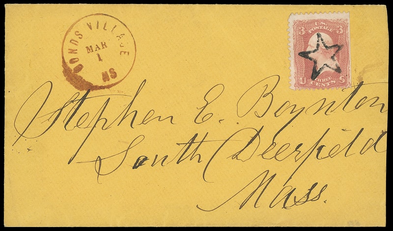 Open Star, bold strike cancels 3¢ rose (65), s.e. at right, red "Bonds Village Ms, Mar 1" cds on orange cover to South Deerfield Mass., Very Fine.