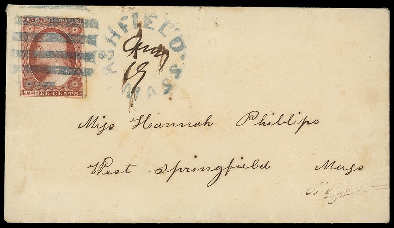 Ashfield, Mass. "Jun 19", blue rimless cds with manuscript month on cover bearing 3¢ brownish carmine (11) , wide margins to touched, tied by large blue grid cancel West Springfield Mass., Very Fine, ex-Caplain .