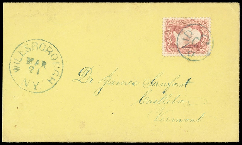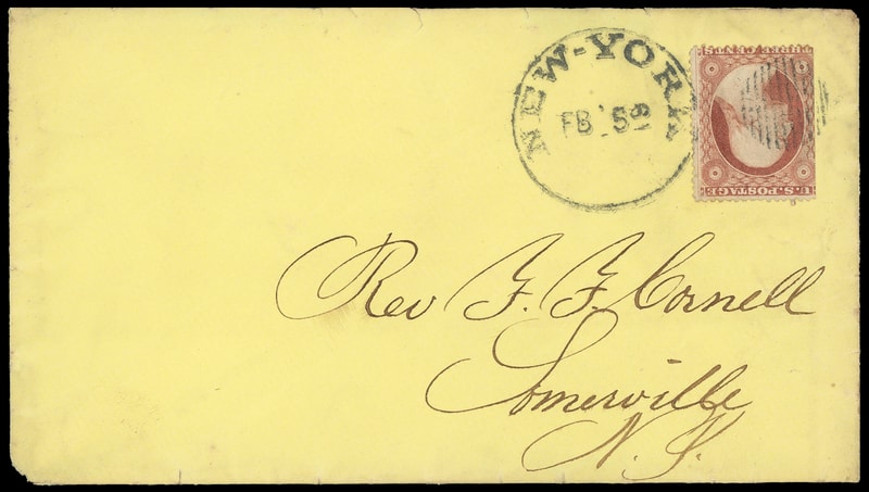 "New-York, FB' 5 61" Norton Patent, duplex device with circular grid cancel tying 3¢ dull red (26) on yellow 1861 cover to Somerville N.Y., original dateline letter accompanies, small edge flaws, Very Fine and rare use of the Norton patent.