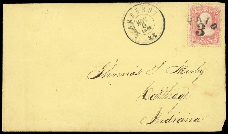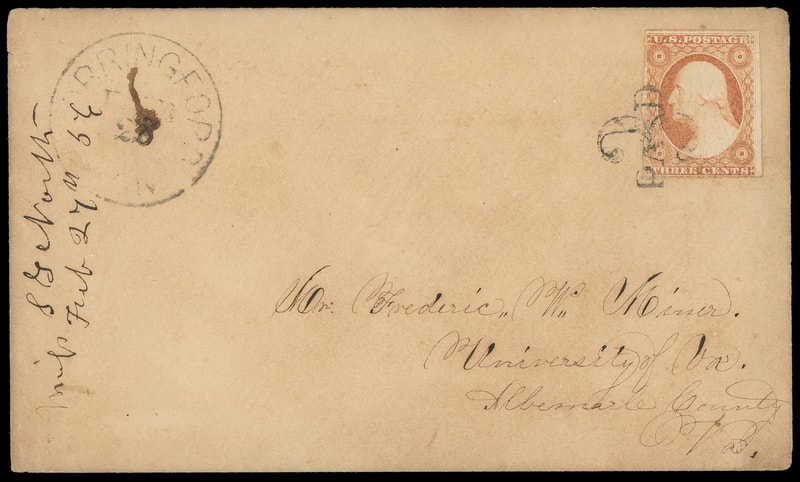 "Paid 3", unusual intertwined handstamp ties 3¢ dull red (11) , margins to touched, matching "Torringford, Con. Feb 28" cds with ms. day update on buff cover to the University of Virginia, Va., 1856 docketing at left; some edge wear, F.-V.F. and rare cancel.