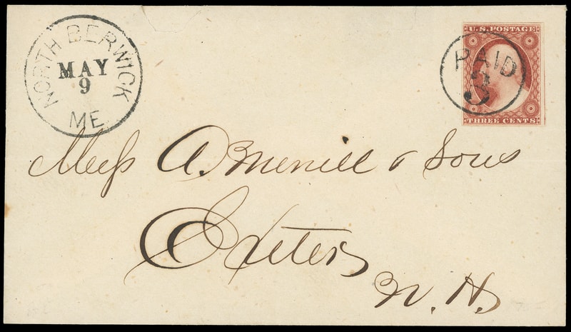"Paid 3" in Circle, clear strike ties 3¢ dull red (11), large to huge margins, rich color, matching "North Berwick Me. May 9" cds on cover to Exeter N.H.; couple opening tears, Very Fine and choice strike.