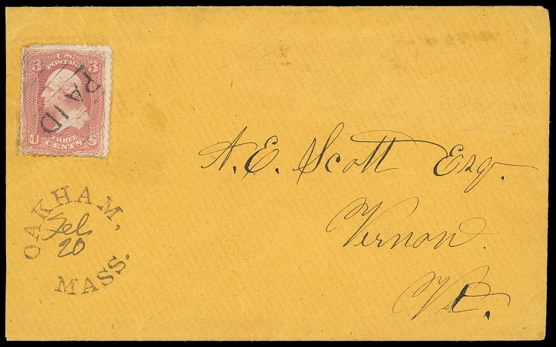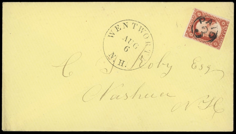 "Paid 3", bold strike cancels 3¢ dull red (11) , large margins except in at bottom, rich color, matching sharp "Wentworth N.H., Aug 6" cds on yellow cover to Nashua N.H., Very Fine, ex-Saadi .