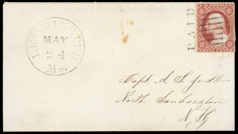 "Paid" Grid, sharp strike cancels 3¢ dull red (11A) , pos. 79R2L, matching "Leominster Ms. May 24" cds on cover to New Hampshire; tone spot, Very Fine, ex-Saadi .