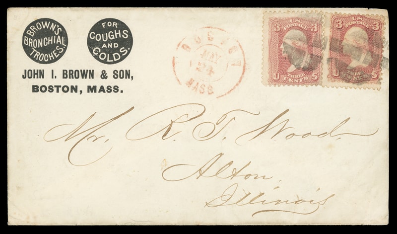 (Medical) Brown's Bronchial Troches for Coughs and Colds, John I Brown & Son, Boston Mass., black illustrated ad showing two pills on amber cover bearing two 3¢ rose (65) singles, tied by segmented grid cancels, red "Boston, Mass. May 24" cds to Alton, Ill.; barely reduced at right, fresh and Very Fine.