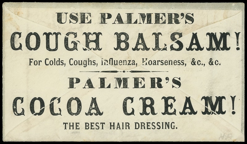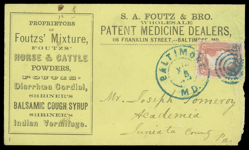 (Medical) Patent Medicine Dealers, S.A. Foutz & Bro., Baltimore Md., medical advertising for Foutz's Mixture, Poutzs' Diarrhea Cordial, Schriner's Balsamic Cough Syrup, etc on yellow cover bearing 3¢ rose (65) tied by blue "Baltimore Md. Mar 5, 1862" cds duplex to Academia Pa.; reduced at right, otherwise Very Fine.