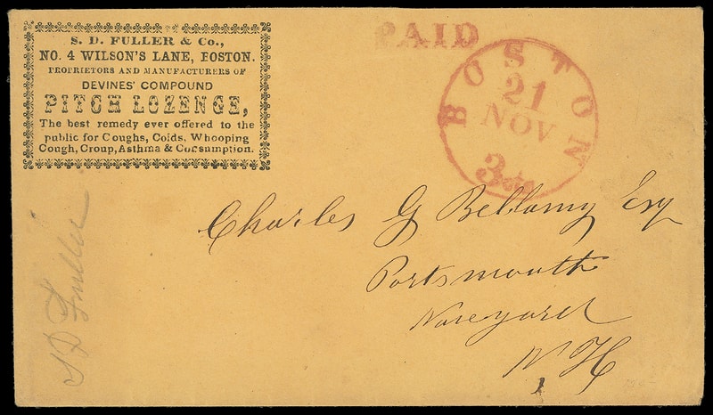 (Medical) Devines' Compound Pitch Lozenge, S.D. Fuller & Co., Boston Mass., fancy framed corner card with "The best remedy ever offered to the public for Coughs, Colds, Whooping Cough, Croup, Asthma & Consumption" slogan on orange cover with red "Boston '3cts' 21 Nov" and matching "Paid" handstamp to Portsmouth N.H.; partial flap, Very Fine and choice early medical ad.