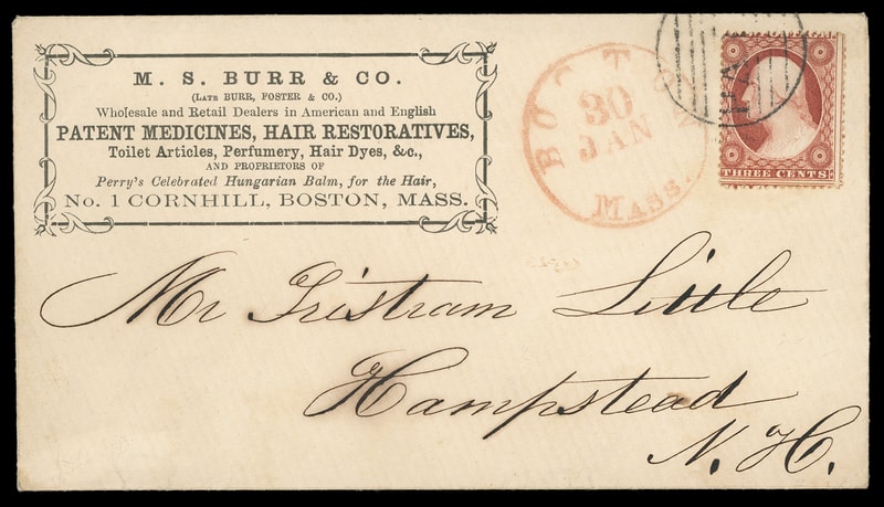 (Medical) Patent Medicines, Hair Restoratives, etc M.S. Burr & Co., Boston Mass., fancy framed corner card on cover bearing 3¢ dull red (25) tied by large "Paid" grid, red "Boston, Mass. 30 Jan" cds on amber cover to Hampstead N.H., Very Fine and choice early medical ad.