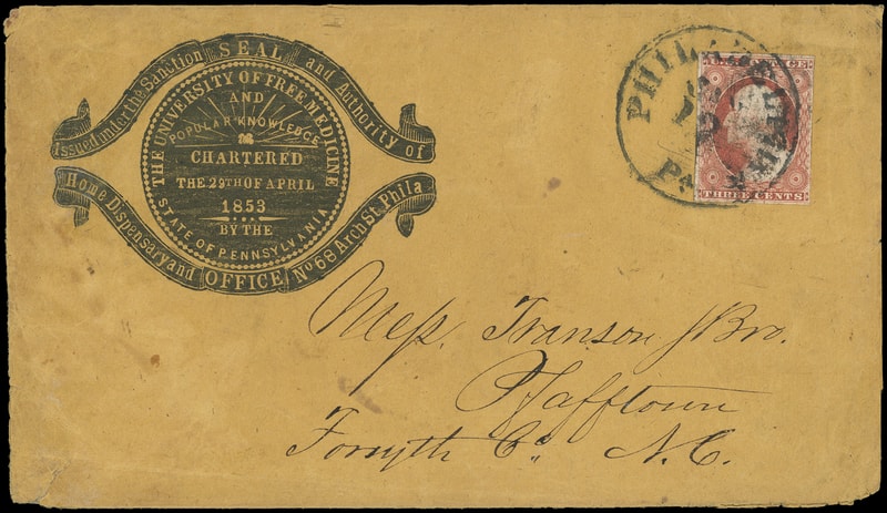 (Medical - Schools) University of Free Medicine, State of Pennsylvania, Philadelphia Pa., fancy medal and ribbon corner card on orange buff cover bearing 3¢ dull red (11) tied by "Philadelphia Pa., Jan 12" cds to Pfafftown N.C.; cover tear and wear, Fine.