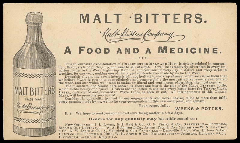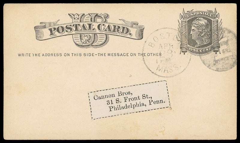 (Medical) Malt Bitters, Malt Bitters Co., Weeks & Potter, illustrated advertisement showing bottle on reverse of 1¢ postal card (UX5) canceled by "Boston Mass. Apr 28" duplex with negative "E" in circle cancel with address label to Philadelphia Pa., Very Fine.