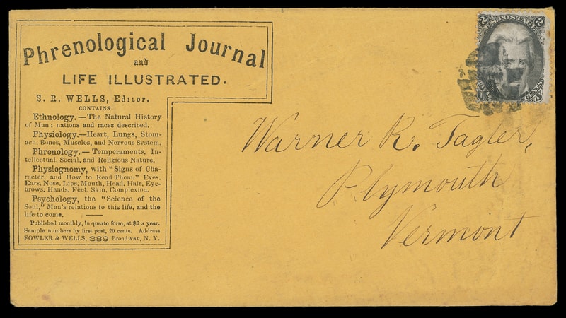 (Medical) Phrenological Journal, Fowler & Wells, New York N.Y., framed ad on unsealed orange buff cover bearing 2¢ black (73) , corner flaw, tied by circular grid cancel to Plymouth Vt., F.-V.F. and scarce.