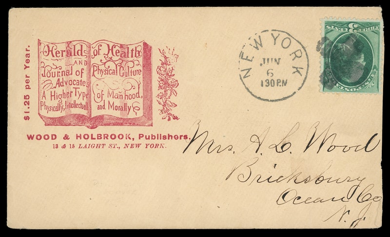 (Medical) Herald of Health, Wood & Holbrook Publishers, New York N.Y., red illustrated corner card showing open book on buff cover bearing 3¢ green (158) tied by cross duplexed with "New York, Jun 6" cds to Bricksbury N.J.; reduced at right, F.-V.F.