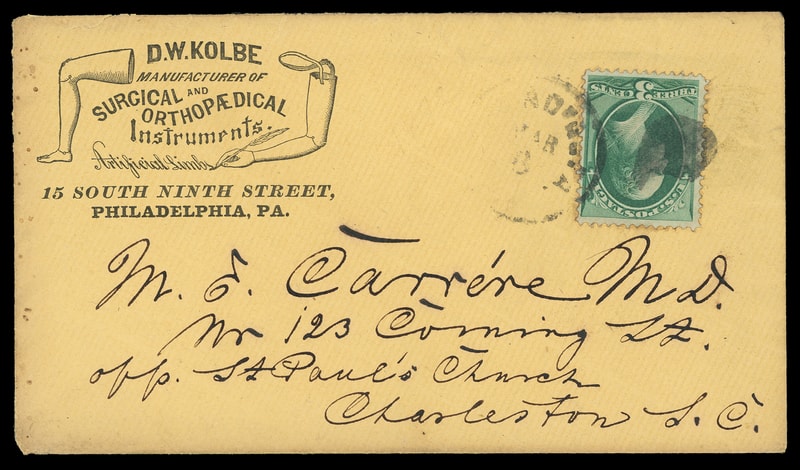 (Medical) Surgical and Orthopaedical Instruments, D.W. Koble, Philadelphia Pa., illustrated ad showing replacement limbs on buff cover bearing 3¢ green (158) , small tear, tied by partial "Philadelphia, Pa. Mar 6" cds to Charleston S.C.; bit of flap missing, Very Fine.