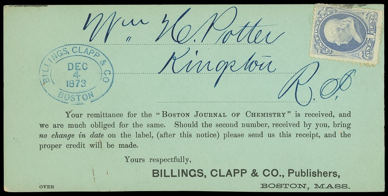 (Medical) Citrate of Magnesia, Billings, Clapp & Co., Boston Mass., light green forerunner card with illustration of bottle , reverse of card bearing 1¢ ultramarine (145) affixed at edge, barely canceled by cork, blue "Billings, Clapp & Co. Boston, Dec 4, 1873" double-oval company handstamp to Kingston R.I., Very Fine.