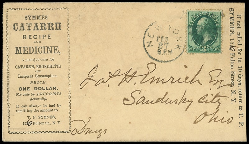 (Medical) Symmes' Catarrh Recipe and Medicine, T.P. Symmes, New York N.Y., fancy boxed advertising on amber cover bearing 3¢ green (147) canceled by circle of wedges duplexed with "New York Feb 27" cds to Sandusky City, Ohio; reduced slightly at right, Very Fine.