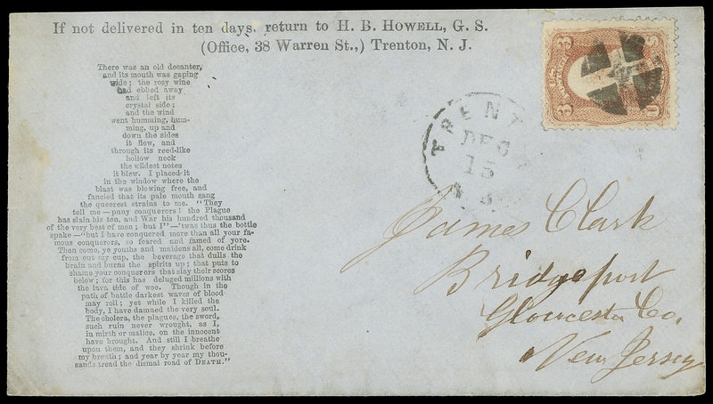 (Medical - Temperance) H.B. Howell G.S., Trenton N.J., unusual temperance propaganda ad with text in decanter profile ending with " …year by year my thousands tread the dismal road of Death " on blue cover bearing 3¢ rose (65) canceled by quartered cork duplexed with partial "Trenton N.H. Dec 15" cds to Brideport N.J.; bit of flap torn away, Very Fine.