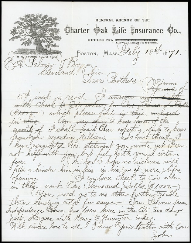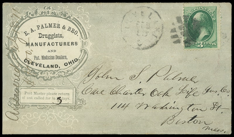 (Medical - Druggist) E.A. Palmer & Bro. Druggists, Mfg. and Patent Medicine Dealers, Cleveland Ohio, overal gray shaded ad cover bearing 3¢ green (147) tied by segmented cork cancel duplexed with "Cleveland O. Feb 15" cds to Boston Mass, docketed "Answered July 1871, $1000.-" at left; reduced slightly at left, includes original Charter Oak Life Insurance Co. illustrated letterhead enclosure back home to his brother, Very Fine.