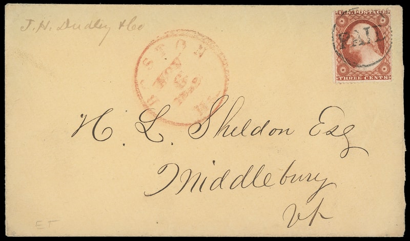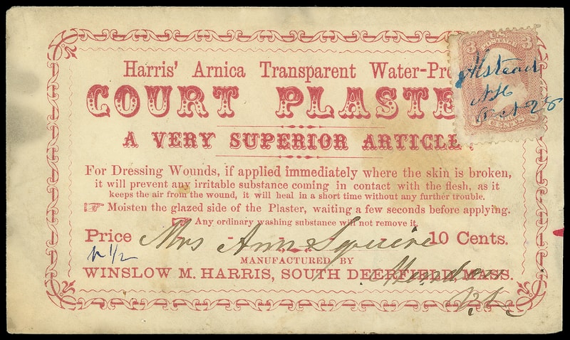 (Medical) Harris' Arnica Transparent Water-Proof Court Plaster, Winslow M. Harris, South Deerfield Mass., red overall ad on cover bearing 3¢ rose (65) tied by blue ms. "Alstead NH, Oct 25" postmark to Mendon, Vermont; reduced slightly at right, some soiling and tone spot, F.-V.F. and rare early medical ad, ex-Biddle .