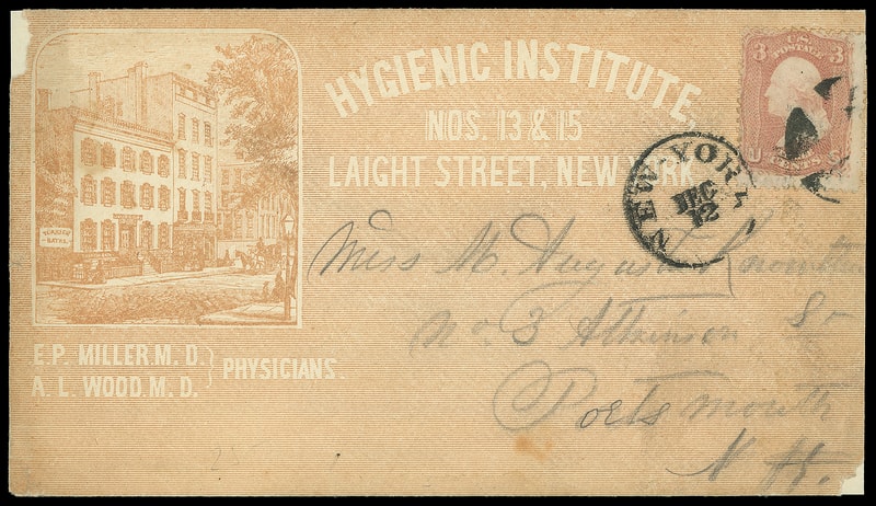 (Medical) Hygienic Institute, New York N.Y., orange overall illustrated building ad with D.H. Prime flap imprint on cover bearing 3¢ rose (65), small tear, tied by segmented cork duplexed with "New-York, Dec 12" cds to Portsmouth N.H.; reduced at right, some paper loss at corners, Fine appearance.