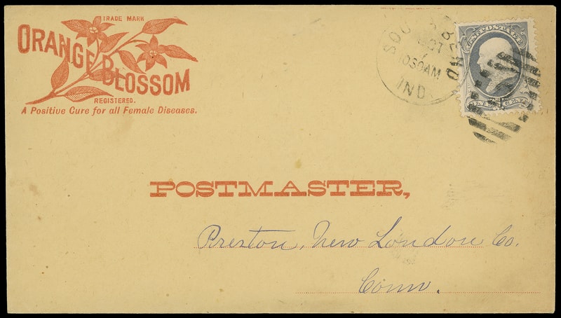 (Medical) Orange Blossom, A Positive Cure for all Female Diseases, orange illustrated corner card showing orange blossom on unsealed buff cover bearing well centered 1¢ gray blue (206) tied "South Bend Ind. Oct 7" duplex to Preston Conn., Very Fine.