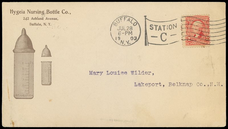 (Medical) Hygenia Nursing Bottle Co., Buffalo N.Y., illustrated ad showing baby bottles on cover bearing 2¢ carmine (301) tied by "Buffalo N.Y. Jul 28, 1903" Station C ovate flag machine cancel to Lakeport N.H., Jul. 2nd arrival backstamp, Very Fine.