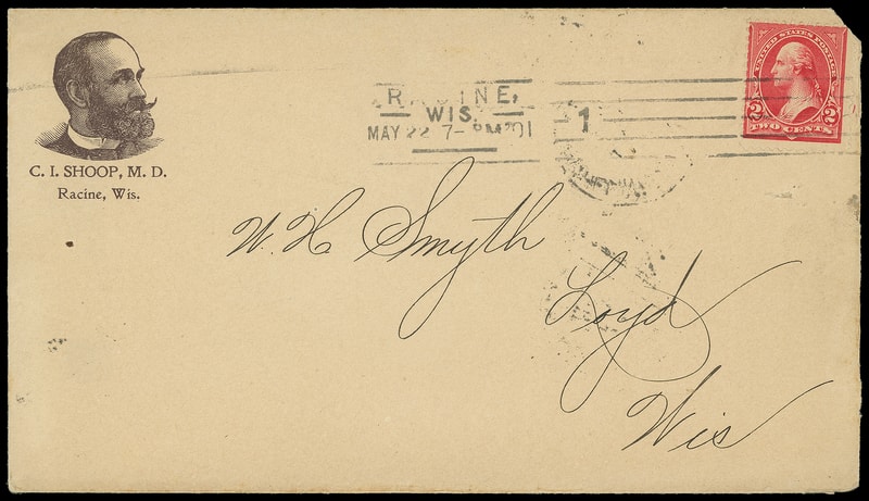 (Medical) C.I. Shoop, M.D., Racine, Wisconsin, dark purple illustrated corner card showing Dr. Shoop profile and reverse with text ad "Book on Dyspepsia" etc on amber cover bearing 2¢ carmine (279B) tied by "Racine Wis. May 22 '01" machine cancel to Loyd Wisc.; clipped top right corner, F.-V.F.