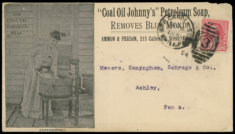 (Medical) "Coal Oil Johnny's" Petroleum Soap, Ammon & Person, Philadelphia Pa., illustrated ad design showing woman washing laundry, reverse with text advertising touting medical properties on 1894 cover bearing 2¢ carmine (220) tied by bold "Spr. Gardens Sta., Phila. Pa., Sep 4 '94" duplex to Ashley Pa.; some edge wear, Very Fine.