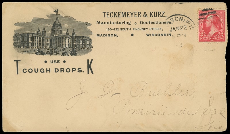 (Medical) Cough Drops, Teckemeyer & Kutz, Madison Wisc., illustrated building advertising on cover bearing 2¢ rose carmine (279Bc) tied by partial "Madison, Wisc. Jan 22 '96" duplex to Prairie du Sac, Wisc.; reduced slightly irregular at right, Fine.
