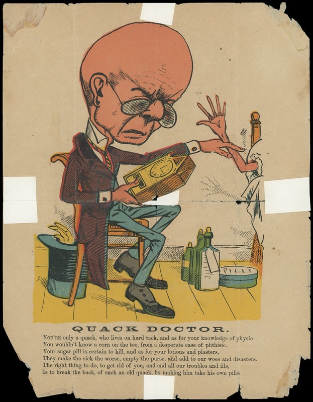 (Medical) "Quack Doctor" Penny Dreadful Valentine, multicolor comic with interesting verse " …You're only a quack who lives on hard tack, and as for your knowledge of physic, You wouldn't know a corn on the toe, from a desperate case. Your sugar pull is certain to kill, and as for your lotions and plastics… ", entered mails with 1¢ gray blue (206) tied by partial "Kirksville Mo. Feb 14" cds to local addressee; faults, Fine and unusual.