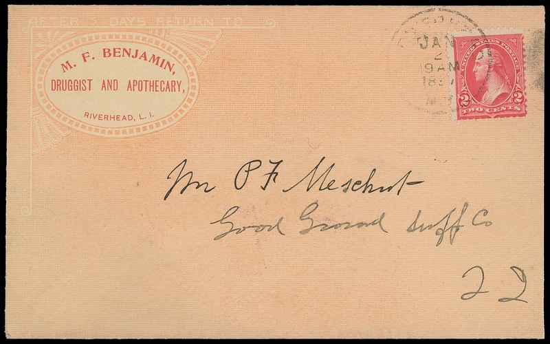 (Medical) M.F. Benjamin, Druggist and Apothecary, Riverhead, Long Island, overall orange shaded advertising cover bearing 2¢ rose carmine (279Bc) tied by "Riverhead N.Y., Jan 2, 1897" duplex to Good Grounds, Long Island N.Y., Jan. 2nd arrival backstamp; reduced a bit at right, Very Fine.