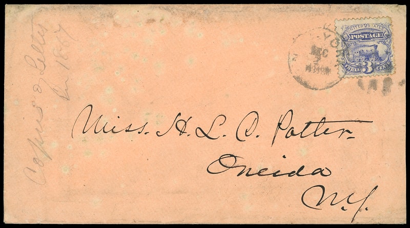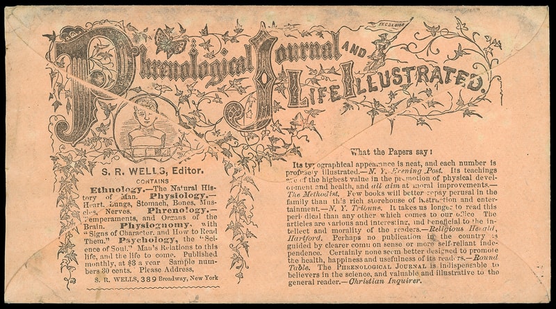(Medical) Phrenological Journal and Life Illustrated, S.R. Wells, Editor, overall illustrated advertising on reverse of salmon envelope bearing 3¢ ultramarine (114) tied by "New York, Dec 7 duplex to Oneida N.Y.; some edge wear, aging and soiling, Fine.
