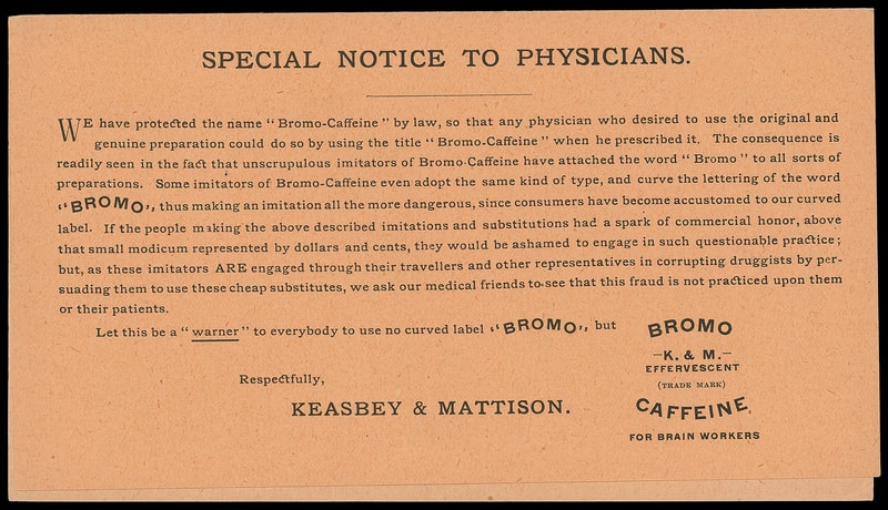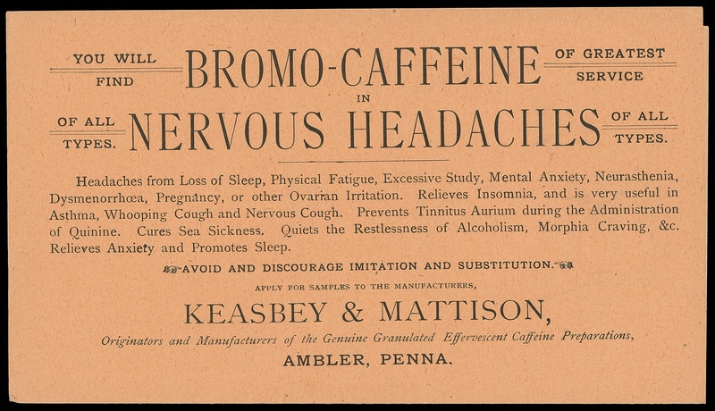 (Medical) Bromo Caffeine for Headaches, Lithiated Potash for Rheumatism, Keasbey & Mattison, Philadelphia Pa., text advertising on unsealed cover bearing 1¢ ultramarine (212) tied by cork cancel duplexed with partial cds to Saco Me., original salmom advertising enclosure "You will find Bromo-Caffeine of Greatest Service"; some light cover aging, F.-V.F.