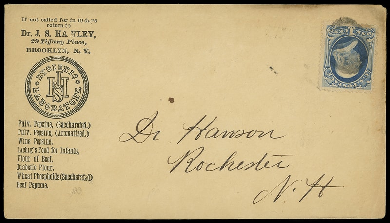 (Medical) Dr. J.S. Hawley, Hygienic Laboratory, Brooklyn N.Y., corner card with coin and products of Pulv. Pepsine, Wine Pepsine, etc. on unsealed buff cover bearing 1¢ blue (156) tied by cork cancel to Rochester N.h., F.-V.F.