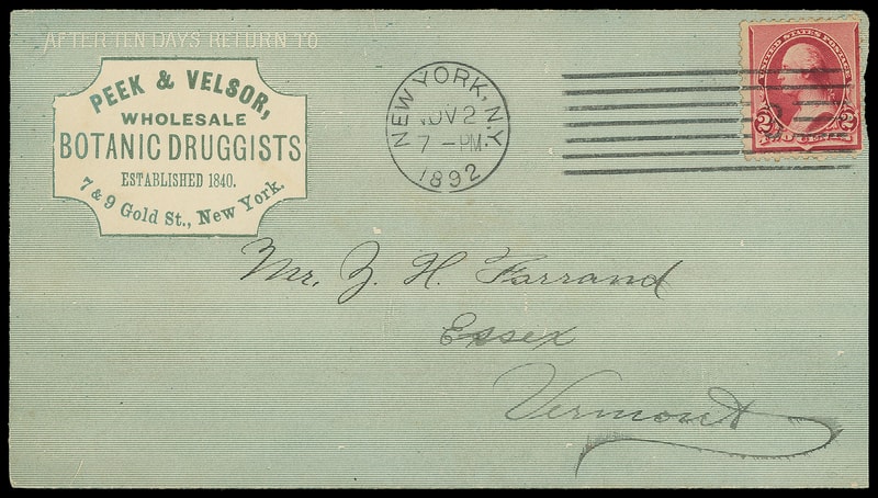 (Medical - Druggist) Peek & Velsor, Wholesale Botanic Druggists, New York City, overal green ad cover bearing 2¢ carmine (220) tied by "New York, N.y. Nov 2, 1892" machine cancel to Essex, Vermont; reduced slightly at right, Very Fine.