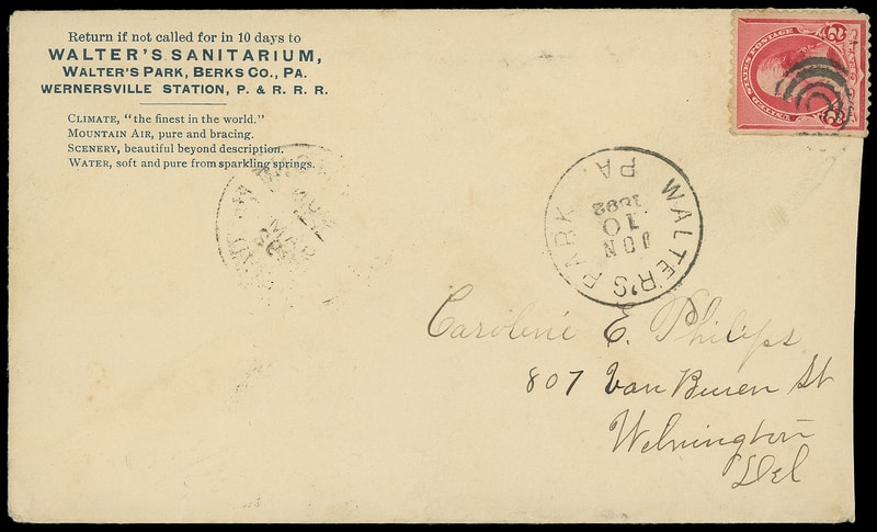 (Medical) Walter's Sanitarium, Walter's Park, Berks Co., Pa., corner card noting "Climate, the finest in the world.", "Mountain Air, pure and bracing" etc on cover bearing 2¢ carmine (220) tied by target cancel, atching "Water's Park Pa., Jun 10, 1892" cds to washington Del.; reduced at right, F.-V.F.