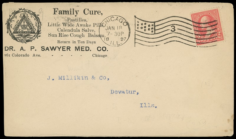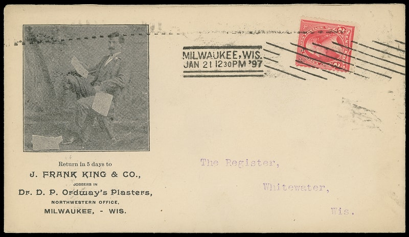 (Medical) Dr. D.P. Ordway's Plasters, J. Frank King & Co., Milwaukee Wisc., illustrated ad design showing Man sitting with Papers on cover bearing 2¢ rose carmine (279Bc) tied by "Milwaukee, Wis. Jan 21 '97" machine cancel to Whitewater Wis., Very Fine.