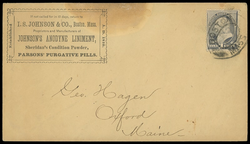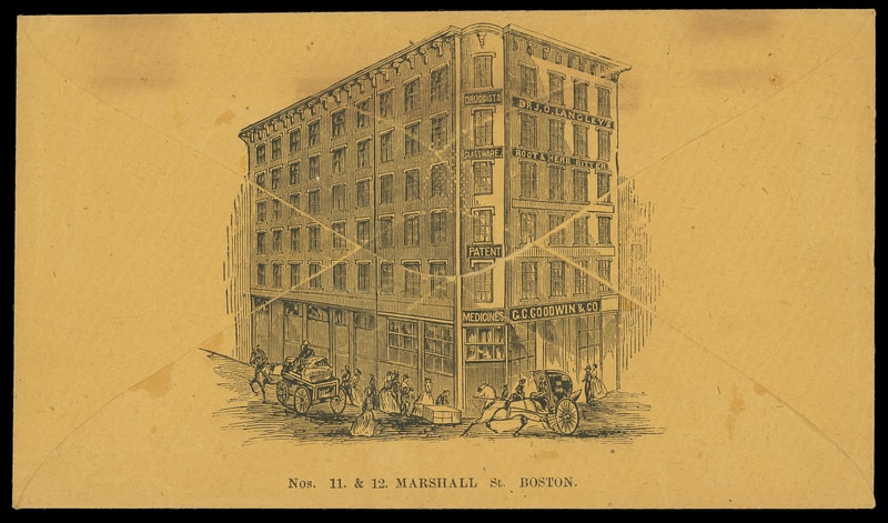 (Medical) Patent Medicines, 11 & 12 Marshall St, Boston Mass., illustrated building advertising on reverse of orange cover bearing 3¢ rose (25) tied by large Boston "Paid" grid, adjacent red "Boston, Mass. 11 Jan" cds to Bangor Me., Very Fine.