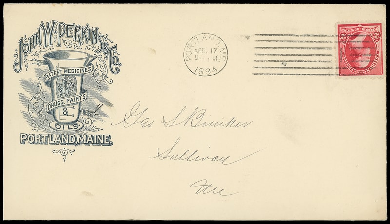 (Medical) John W. Perkins & Co., Patent Medicines, Portland Me., illustrated corner card showing container on cover bearing 2¢ carmine (220) tied by "Portland Me. Apr 17, 1894" machine cancel to Sullivan Me.; reduced slightly at left, fresh and Very Fine.