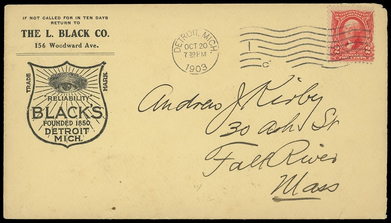 (Medical - Optical) The L. Black Co., Opticians, Detroit Mich., illustrated corner card showing "Reliability" Eye and Shield trademark on amber cover bearing 2¢ carmine (301) tied by "Detroit, Mich. Oct 20, 1903" machine cancel to Fall River, Mass.; Oct. 22nd machine arrival backstamp, Very Fine.