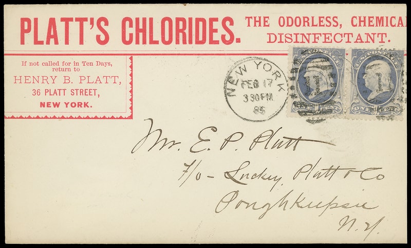 (Medical) Platt's Chlorides, Henry B. Platt, New York N.Y., red "The Odorless, Chemical, disinfectant" corner card on 1885 cover bearing 2¢ gray blue (206) pair tied by "New York, Feb 17 '85" duplex strikes to Poughkeepsie N.Y.; reduced slightly at right, otherwise Very Fine.