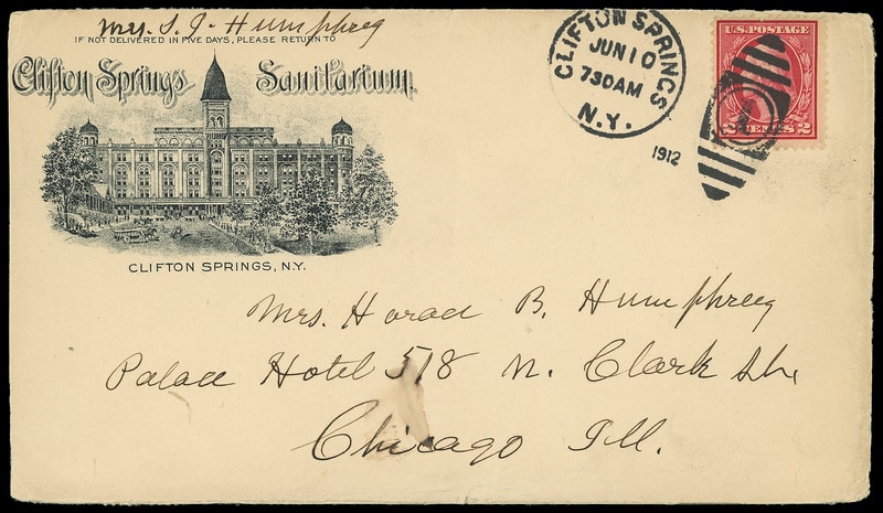 (Medical) Clifton Springs Sanitorium, Clifton Springs N.Y., illustrated building ad on cover bearing 2¢ carmine tied by bold "Clifton Springs N.Y. Jun 10, 1912" duplex to Chicago Ill.; reduced slightly at left and edge wear, F.-V.F.