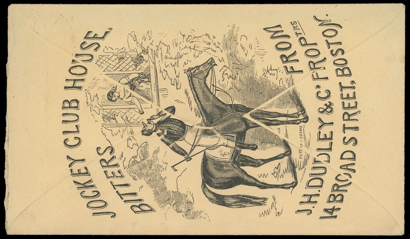 (Medical) Jockey Club House Bitters, J.H. Dudley & Co. Boston Mass., all-over design showing Jockey on reverse of buff cover bearing 3¢ dull red (26) tied by "Paid" in circle cancel, red "Boston Ms. Nov 6" cds to Middlebury Vt., Very Fine.