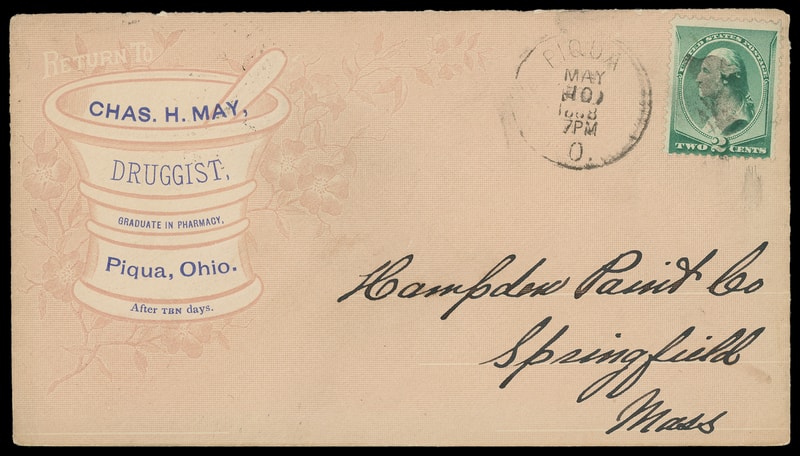(Medical - Druggist) Chas. H. May, Druggist, Piqua Ohio, allover shaded ad design with embossed mortar & pestle on cover bearing 2¢ green (213) tied by cork cancel duplexed with "Piqua O. May 10, 1888" cds to Springfield Mass., May 12th arrival backstamp, Very Fine.