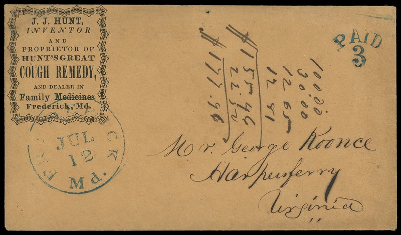 (Medical) Hunt's Great Cough Remedy, Family Medicines, Fredrick Md., ornate boxed advertising on amber stampless cover with blue "Frederick Md. Jul 12" cds and matching "Paid 3" arc handstamp to Harpers Ferry, Virginia, original 1855 letter; light horizontal content wrinking at top, ms. tally docketing, F.-V.F. and scarce medical ad.