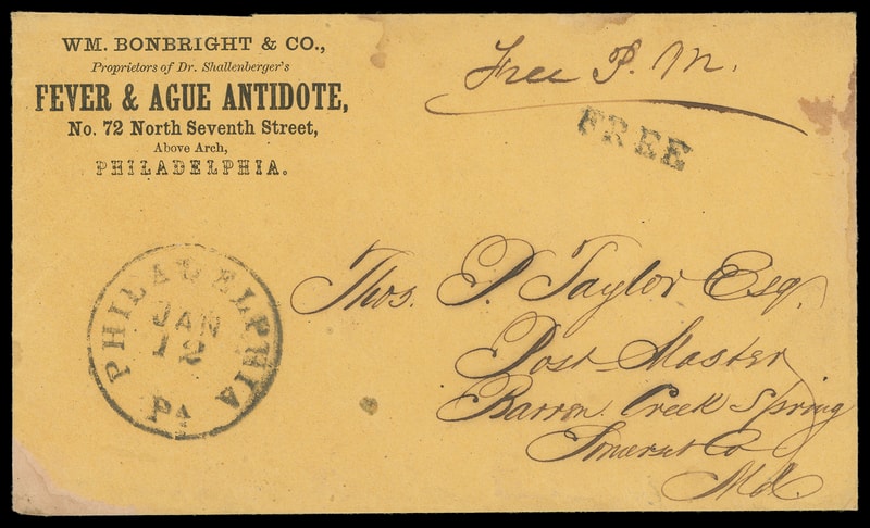 (Medical) Shallenburger's Fever & Ague Antidote, Bonbright & Co., Phila. Pa, printed cornercard on orange cover with postmaster free frank "Free P.M.", "Philadelphia Pa. Jan 12" cds and "Free" rating handstamp to Barren Creek Md.; light edge stains, F.-V.F.